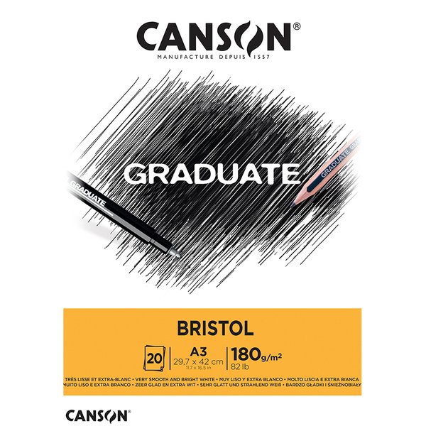Os blocos Canson Graduate Bristol possuem um papel extra branco de 180 g/m² e uma superfície muito lisa. São ideais para desenhos de precisão a lápis ou com marcadores graças a superfície resistente do papel.