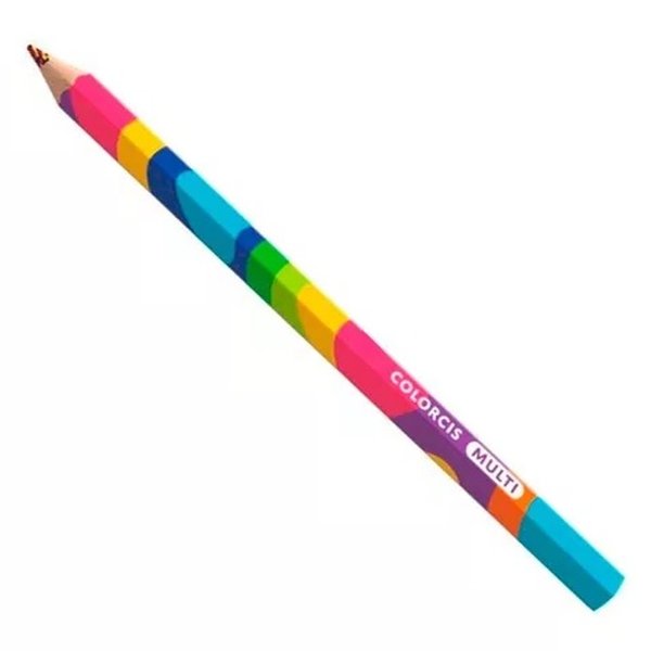 Lápis multicolorido com 4 cores em um só, o que permite efeitos divertidos durante o desenho, devido às variações da mina.